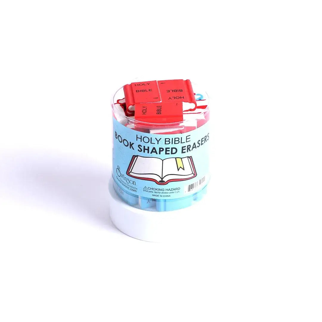 The erasers come in a pack of 36, neatly packaged in a clear plastic tub with a label for easy storage and distribution. Their vibrant red and blue colors make them eye-catching, and the Bible shape reinforces their purpose as both a practical an...