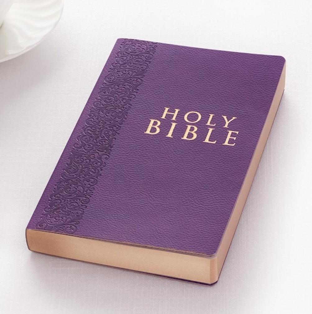 Our Economy Thinline Purple Flexcover Edition of the King James Bible is constructed with quality man-made material with the look and feel of real leather (trade name LuxLeather). The front cover has a debossed design with gold foil titling on the front and spine. Inside, you'll find a double-column format, a helpful Scripture verse finder by topic and a one-year Bible reading plan.