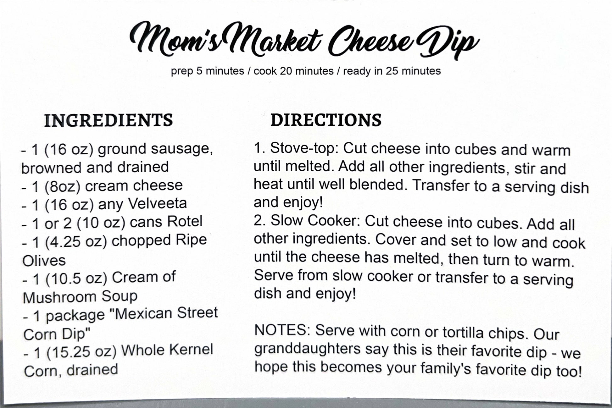 Our Mexican Street Corn Dip is a delicious dip served chilled with veggies, crackers or chips. Our favorite way to utilize this mix is served heated by adding cream cheese, sour cream, drained corn, Rotel and fresh lime juice. You may combine all these ingredients along with the mix in a slow cooker and enjoy with veggies, crackers or chips. Yummy! We offer a recipe card with a cheese dip recipe to go with this mix upon request.